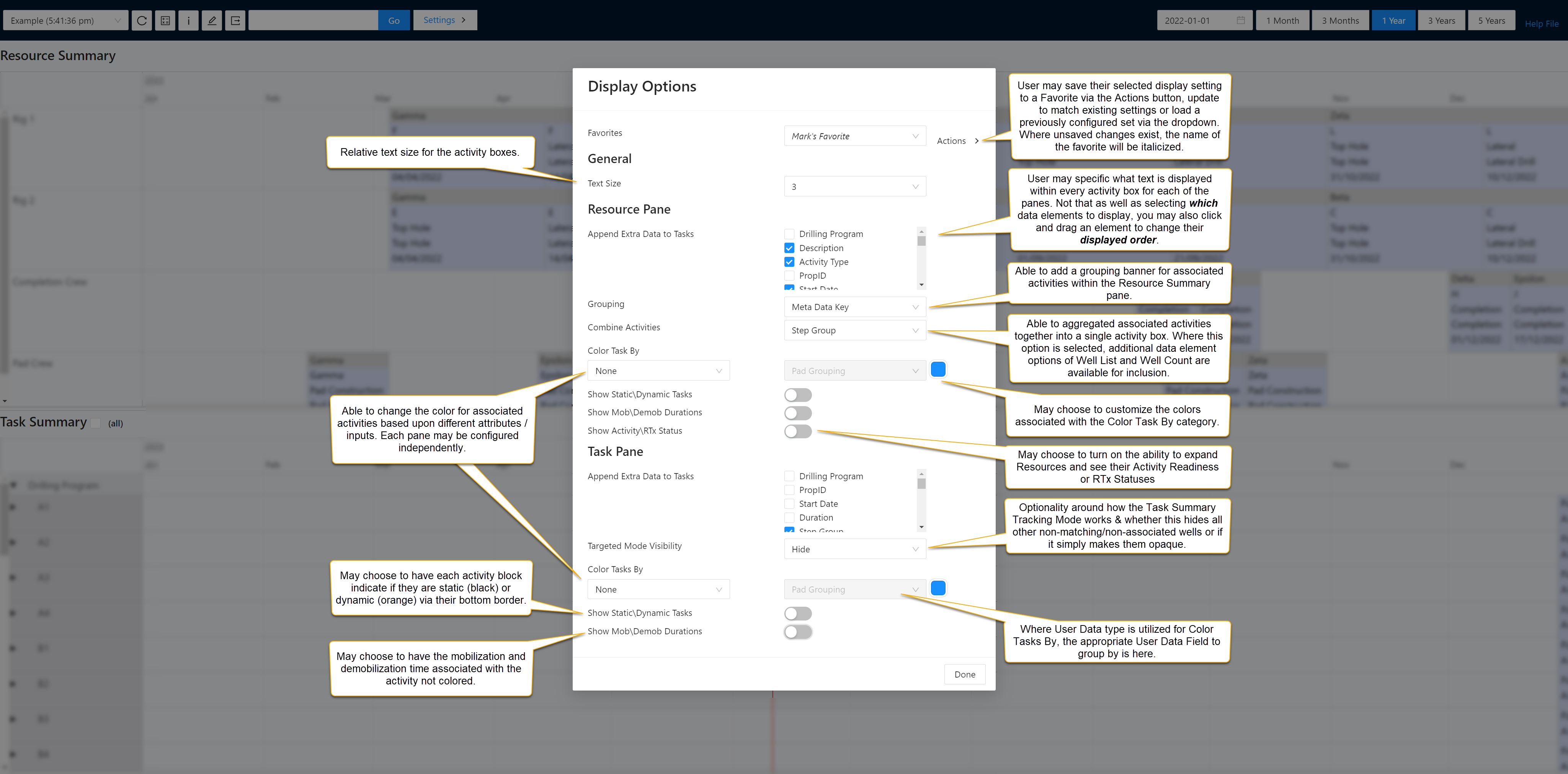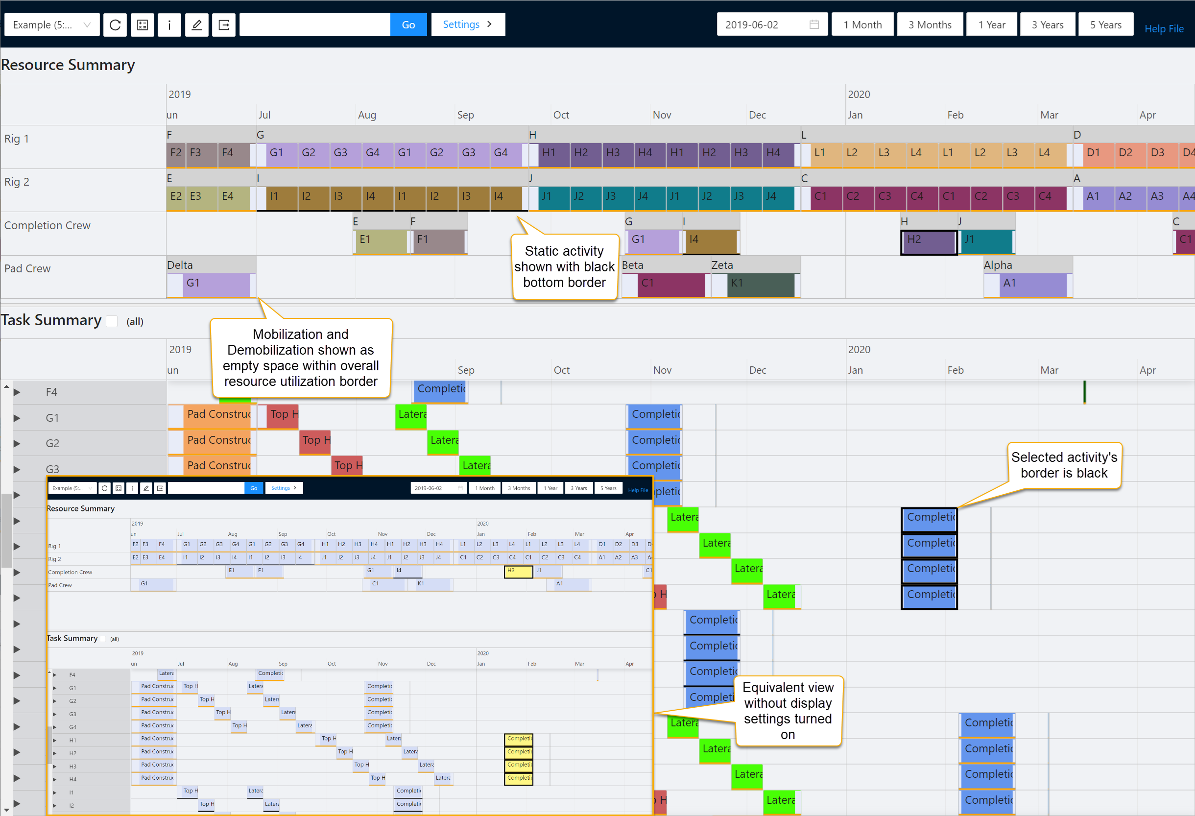 Each pane may be configured independently to how it is colored, whether mobilization and demobilization are shown separately to the actual work of the activity and if there is an indication of the activity’s status (Static/Dynamic).