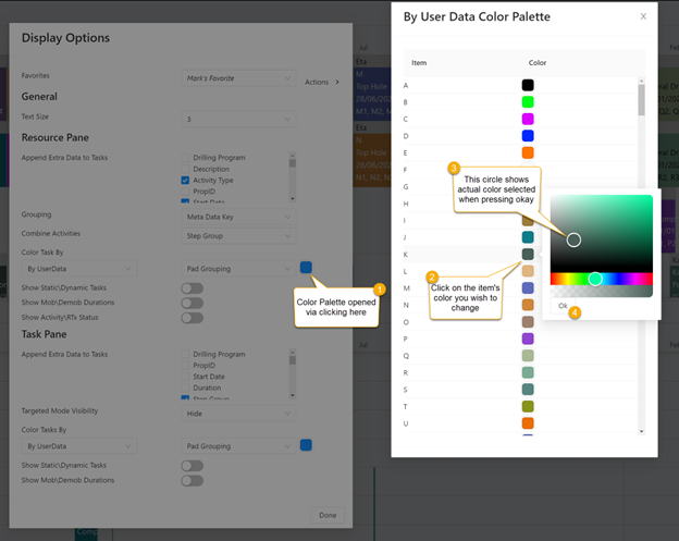 The colors utilized may be customized via the Color Palette. These adjustments are included in the Favorites on save.