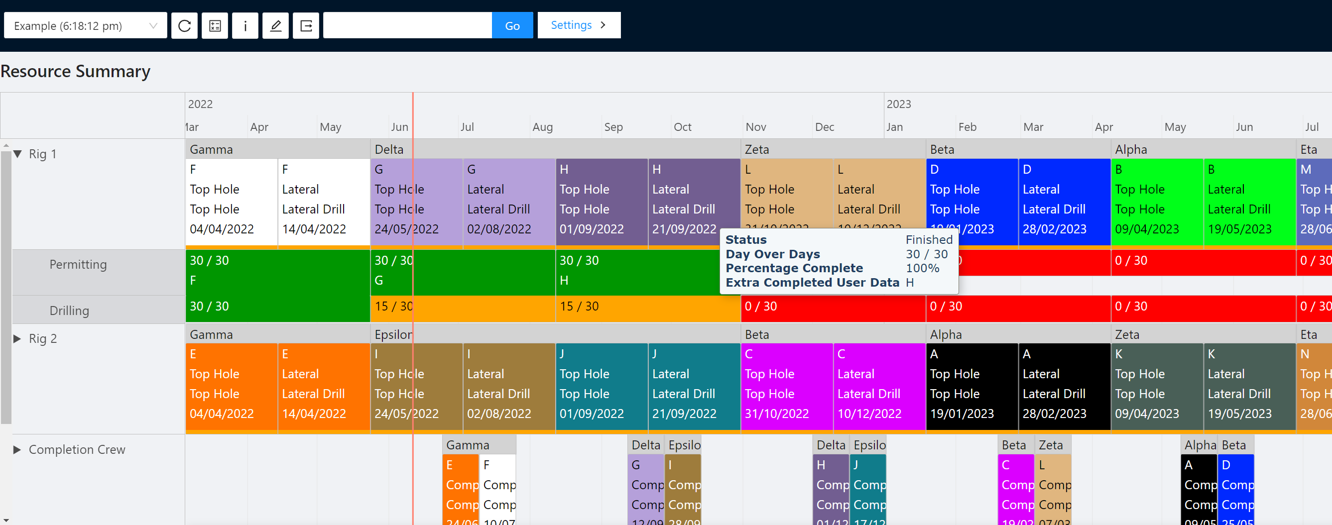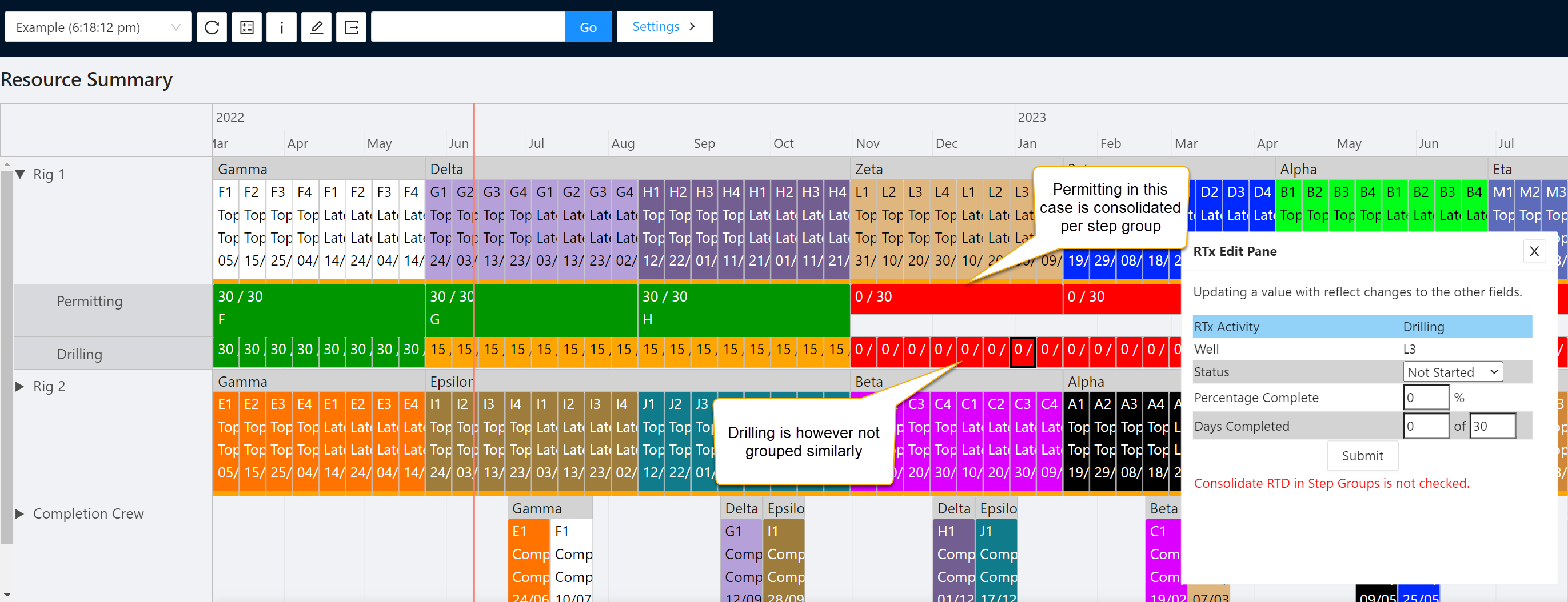 You can then see the status per color and days of days completed as well as any user data you may have associated with the activity either being completed or incomplete. Where activities are combined in the Gantt a single box will be shown spanning the aggregated activities with the worst status displayed. Where in Scheduler > Settings > Work Type Naming you have not selected that RTD is consolidated in Step Groups, individual boxes are shown with an appropriate warning.