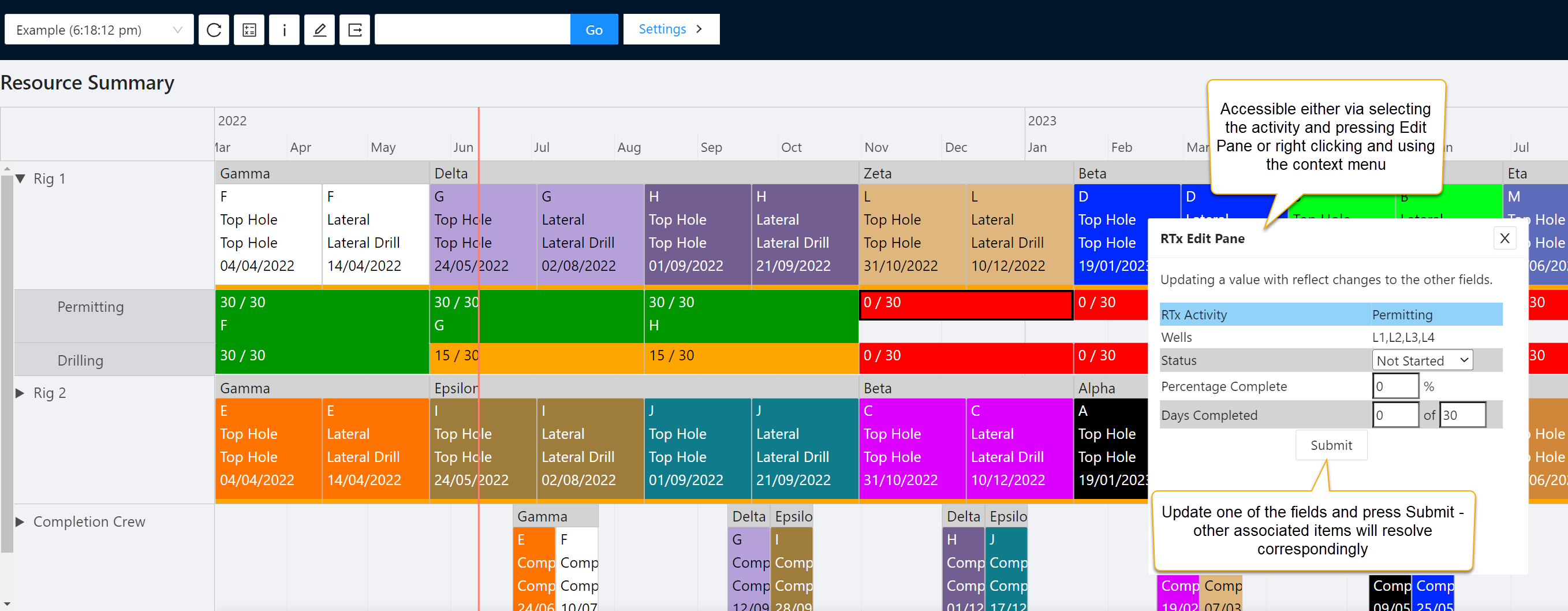 In addition to being able to edit Well Activity Inputs, if you select an Activity RTx Status box and open the Edit Pane, you may also update the status of the activity – with corresponding changes made to the non-inputted field as well as into the well list / on the static activity within the network screen as applicable.