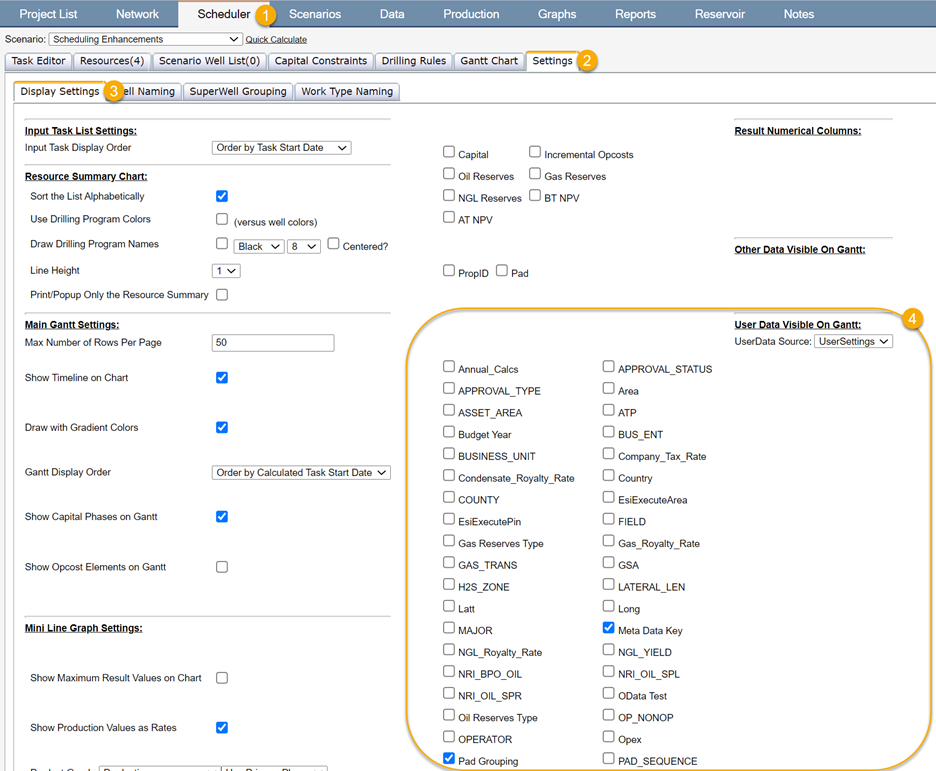Displayed text for each of the Resource and Task Summary Panes may be configured independently under the ‘Append Extra Data to Tasks’ section for each component. This allows for both adjusting which data elements are added to the default inputs of Well Name in the Resources Summary and Step Description in the Task Summary. The sequence of these inputs may also be adjusted via left clicking on the text option and dragging up or down within the list.