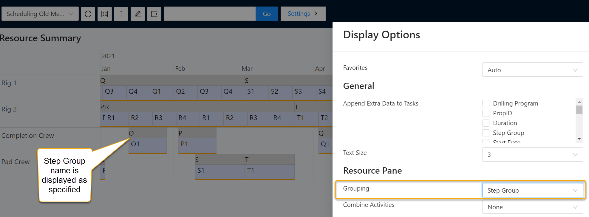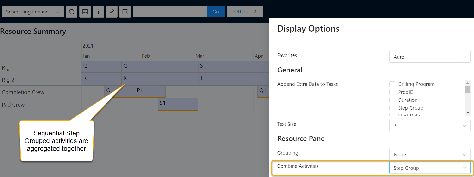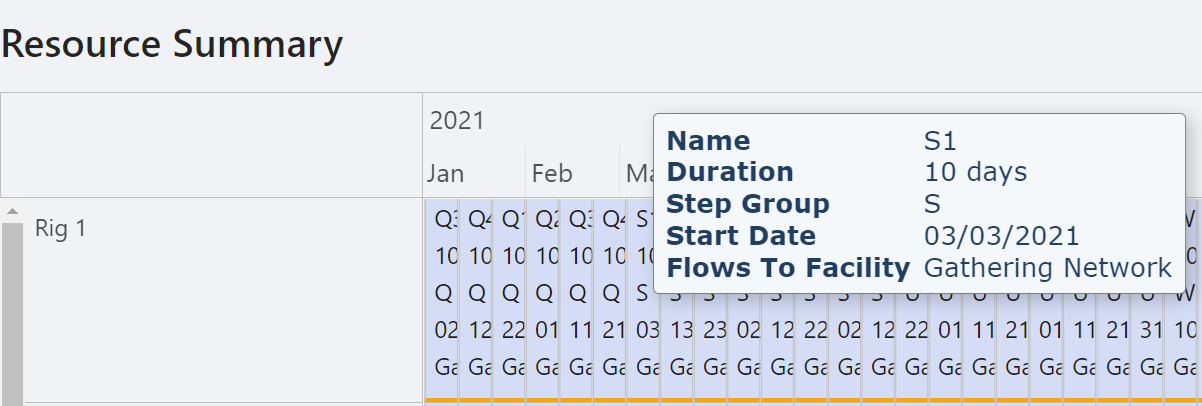Within the Resource Summary, you may choose to group associated activities based upon shared attributes and/or combine activities alike together. This first grouping option enables a shared banner to be displayed above the activity, including the inputted attribute in which it is grouped. Note that if there is unutilized space on the resource between two activities and they are both part of the same grouping, the banner will persist over the gap. In the second case, the activity blocks themselves are combined to assist in ensuring sufficiently wide boxes to display data over longer horizons. In this case, the inputs do adjust slightly to have aggregated values where appropriate.