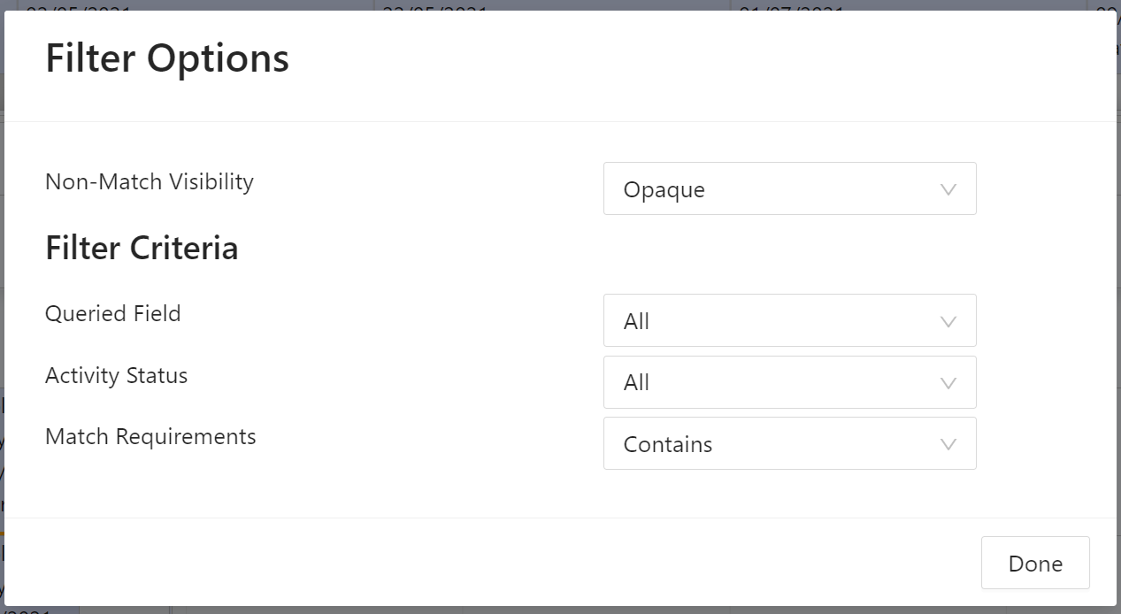 Through using the filter, you may readily change the display to only include certain activities, or resources to personalize to your current ad-hoc requirements.