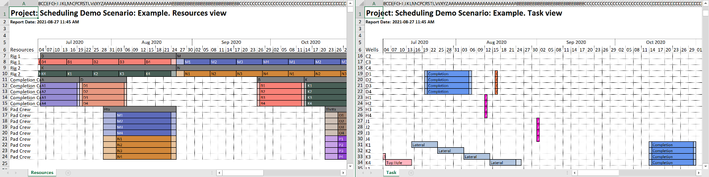This results in two Excel files being generated, one for the Resource Summary and the other for the Task Summary. These files reflect the settings of the display, including coloring and mob/demob as well as grouping.