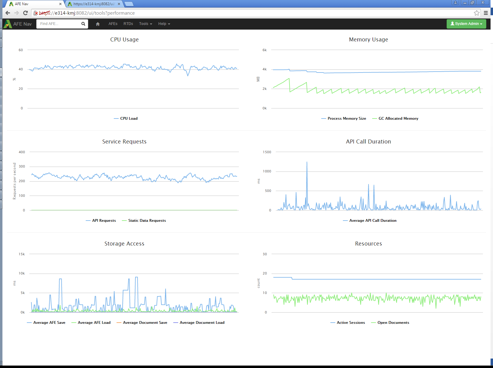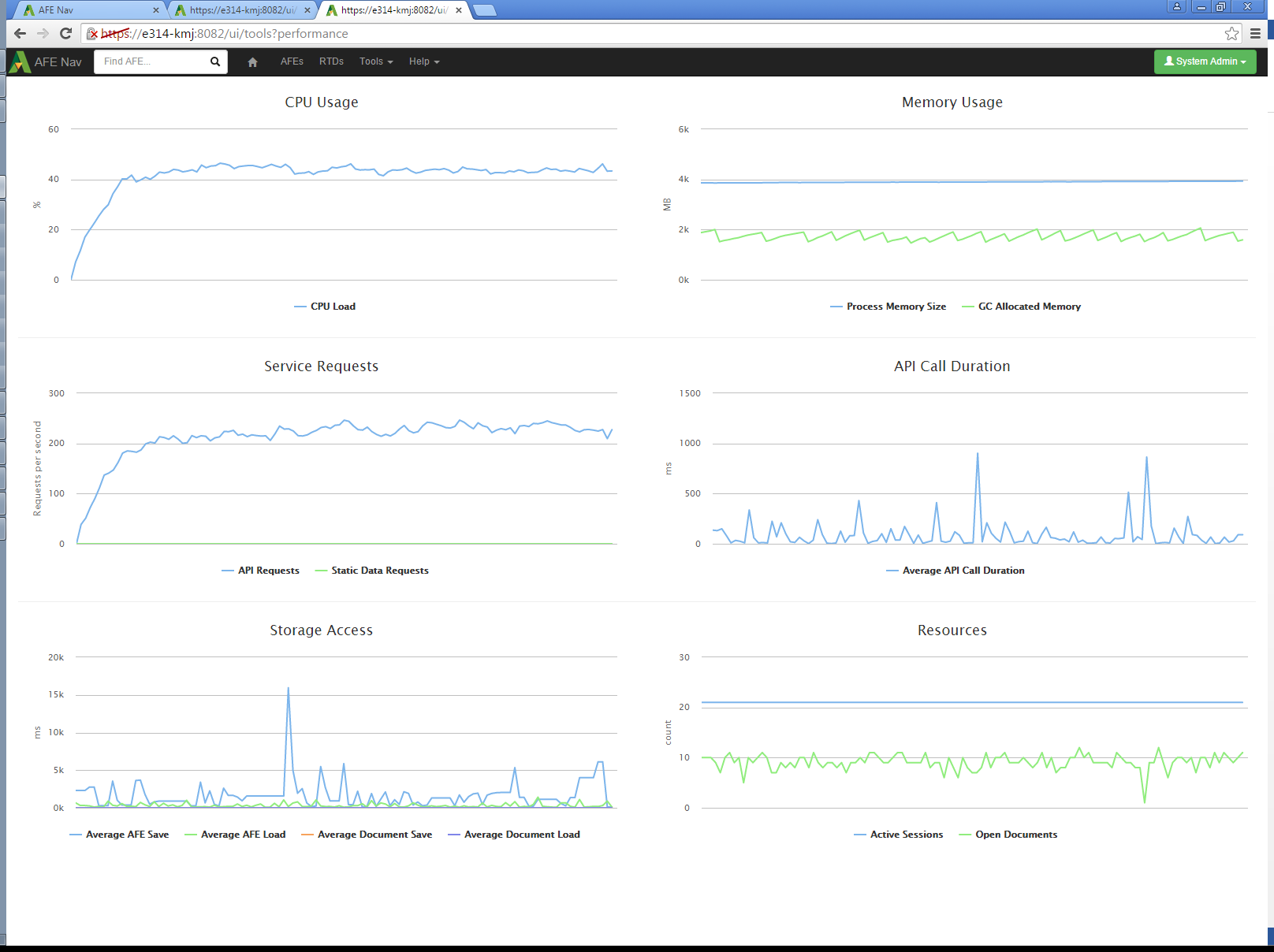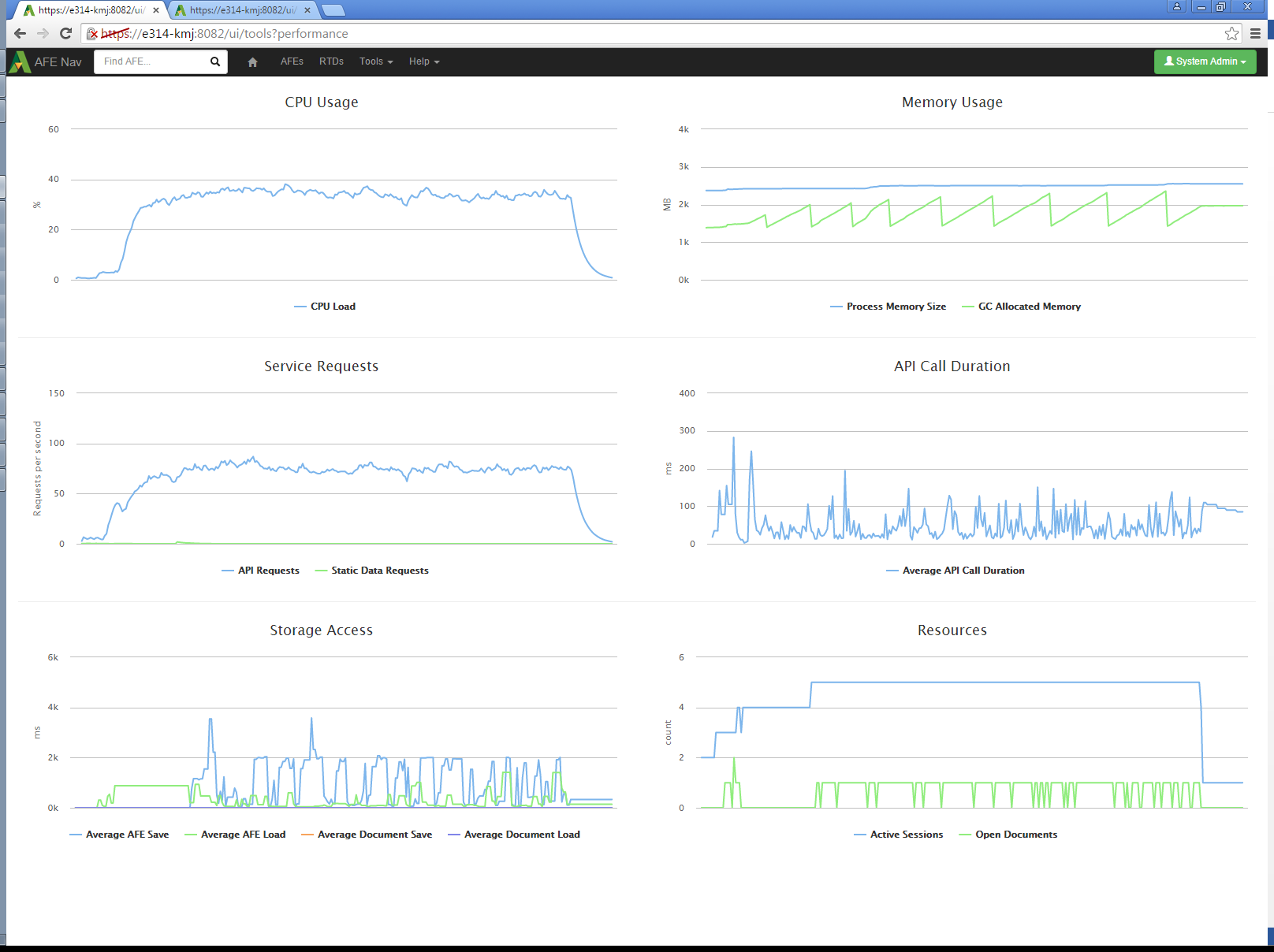 A test system was set up to characterize the performance of the Aucerna Execute service under high load. Traces were taken of common activities and a tool to replay the network requests as fast as possible was created.