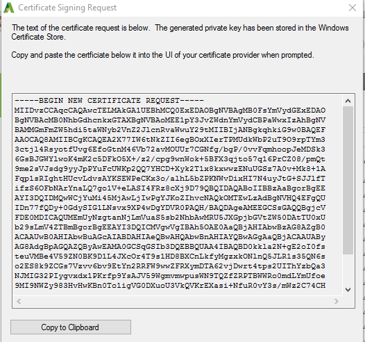 This text will need to be copied and pasted into a form when requesting a certificate from a certificate authority.