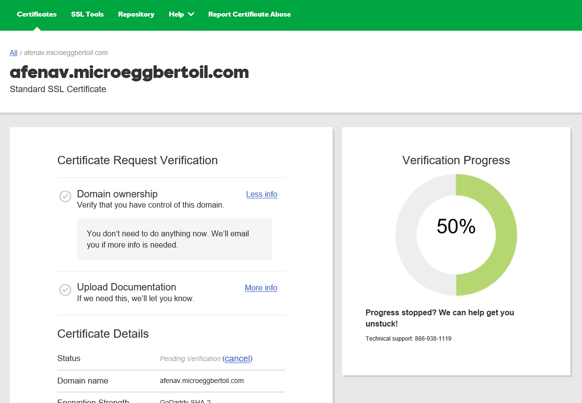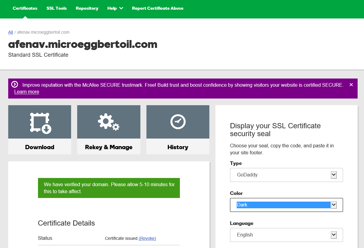 Once the certificate authority has verified that we control our domain they will issue the certificate.