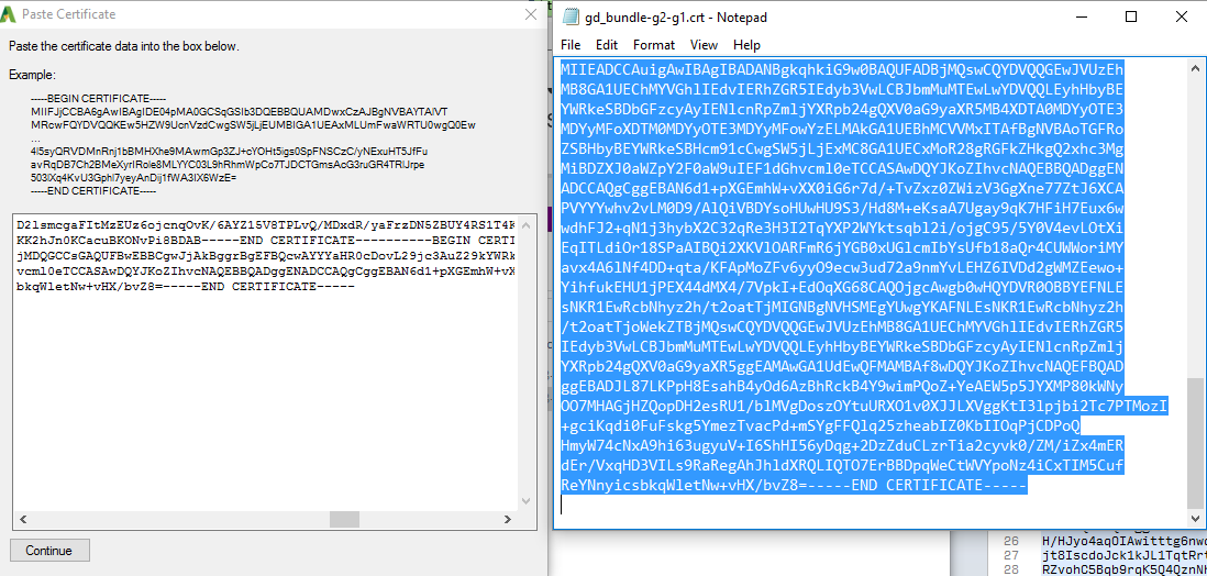 We open the certificate file in notepad (in this example, “3cb6c847e0c9497f.crt”) and copy and paste the content into the ssltool and select “Continue.”
