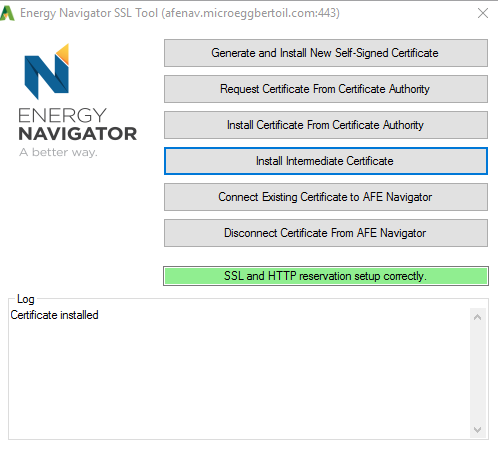 If the CA provided us with intermediate certificates (most do) we need to install those using the “Install Intermediate Certificate” button in the ssltool.