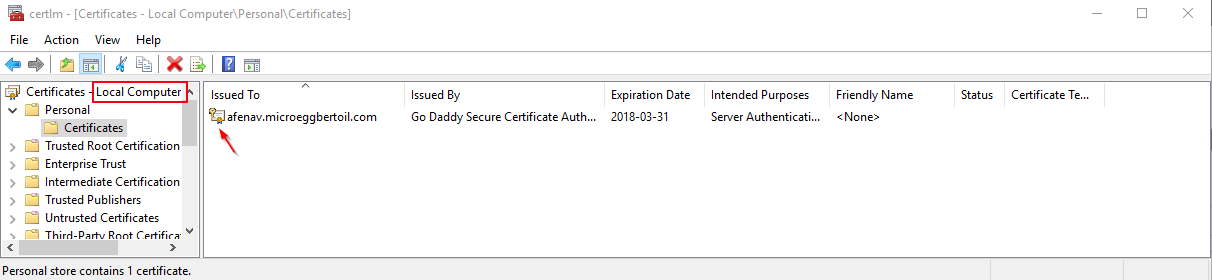 - In the tree select (Console Root > Certificates (Local Computer) > Personal > Certificates)