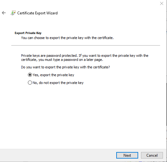 - Export in PKCS #12 format (do not click the “Delete the private key if the export is successful” checkbox)