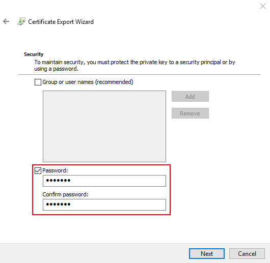 - Click the “Password” box and enter a password. This is used to protect the private key. You will need this password again if you ever need to restore this certificate or load it into another machine.