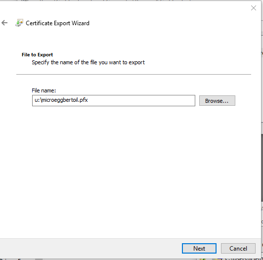 - Select a location for the certificate and then, once exported, ensure it is stored somewhere safe!