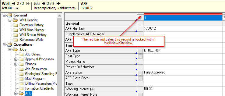 These records are visually identifiable in WellView/SiteView because they have a red bar next to the record which indicates that record is locked.