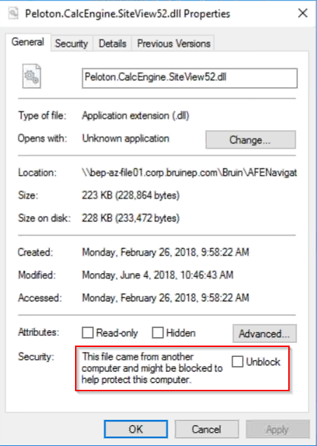 Windows will sometimes mark DLLs copied from untrusted locations as “blocked”. This may cause problem with reading some of the WellView/SiteView calculated fields (required for reading rental costs). After copying the Peloton SDK files into the Aucerna Execute plugins folder, ensure that the following DLLS are unblocked in the file properties.