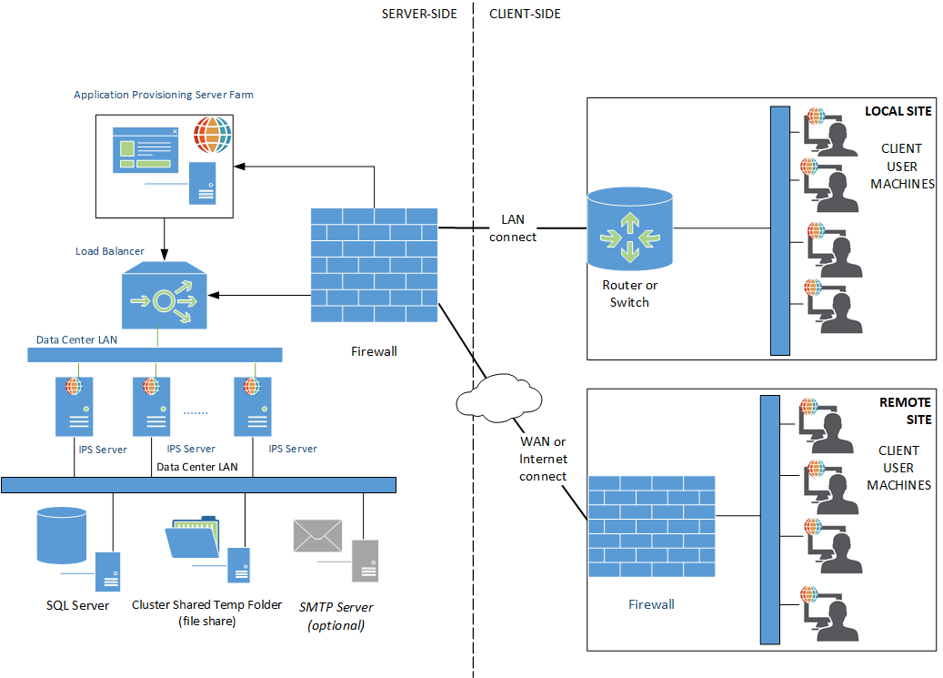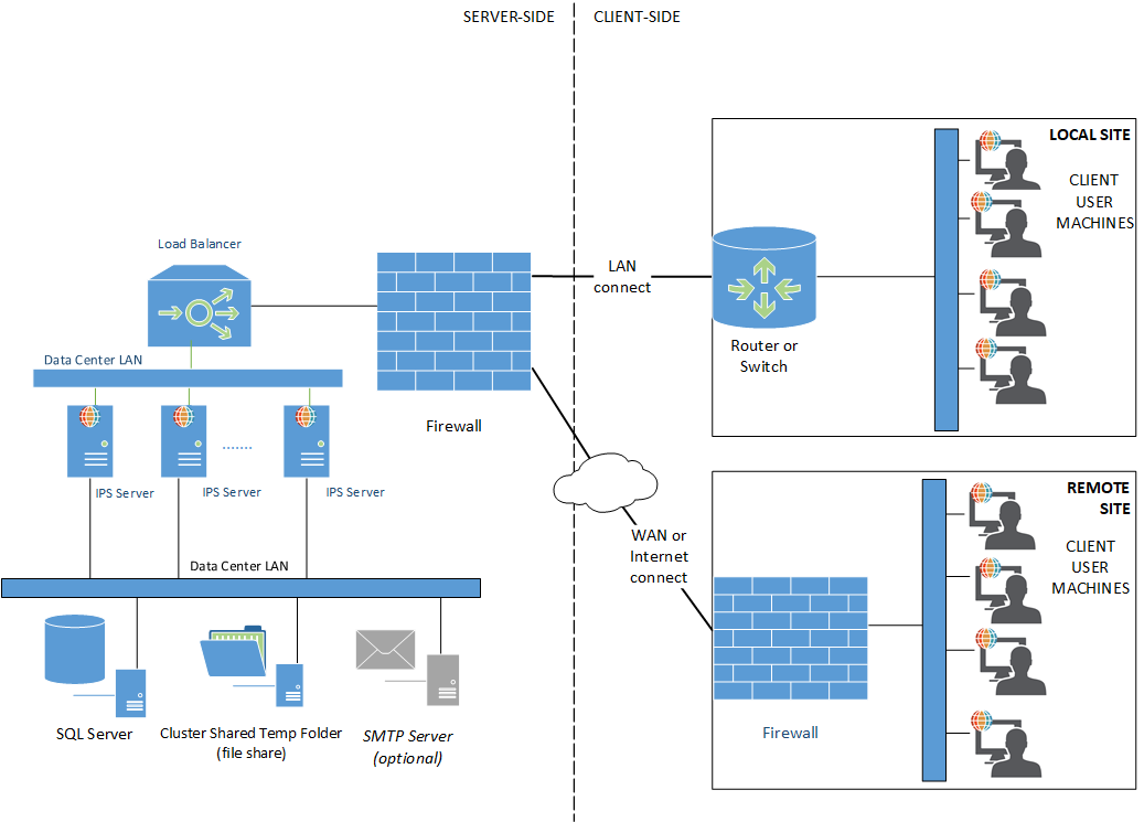 The following diagram shows a typical architecture for a clustered IPS server in a ClickOnce (thick client) deployment. A cluster of three IPS Server machines is shown (which could be scaled up or down, since the server machines do not store user data). All of these machines connect via a LAN to a load balancer which will be the IPS Server endpoint that is addressed by client user machines. The load balancer connects via a firewall to the external environment.