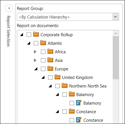 The Report Group selector is set by default to <By Calculation Hierarchy> so that the original calculation hierarchy is used to organize the report documents. The selector shows the Report Groups that have been created. A Report Group uses ordered variables (of type Text) to define a hierarchy where documents will be grouped according to the values of the specified variables in the corresponding projects.