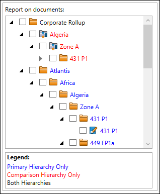 The hierarchy view will show (by highlighting in color) the differences between the two result sets, that is whether a folder/project is contained in only one of the two result sets, or in both.