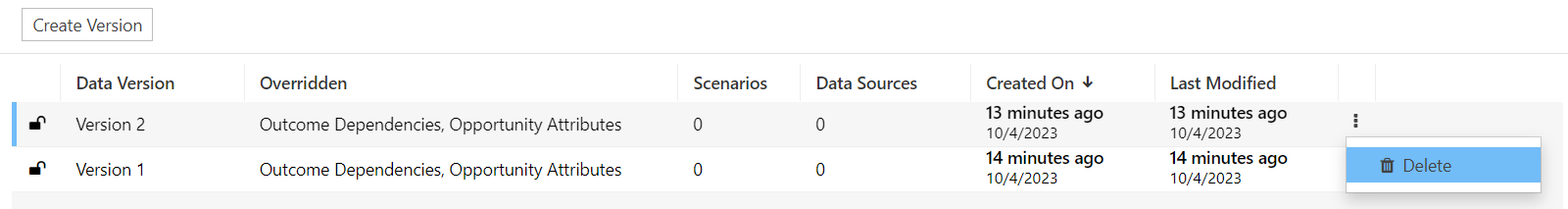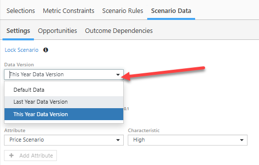 Data Versions created prior to v3.18 will share outcome dependencies and attribute characteristics. Any update to these data in a legacy version will apply to all. Versions created in v3.18 and later will have overrides and will have independent outcome dependencies and attribute characteristics. Overrides are described in the Data Versions list: