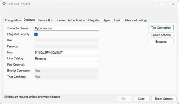 From the Reserves Installer Database tab, click the Update Schema button. In the Reserves Schema Manager window, select the first migration to be applied and click the Migrate button. Repeat until all migrations are applied.