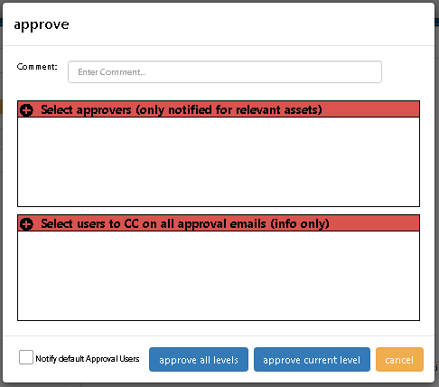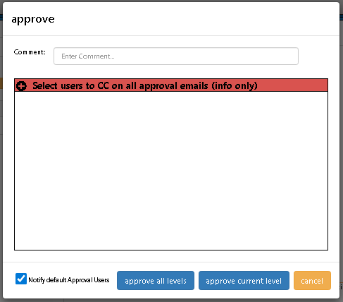 An Approval User can now select from two types of Users to notify by email of an Approval. First off, they can select from a list of all Approvers that they wish to receive an email that the Approval occurred. These selected Users will receive an email ("CC" - information purpose only) notification of the Approval. Secondly, they can also select from a list of Approval Users who have been assigned to the Approval Role needed for the next level of the Approval. These selected Users will receive a email notification ("TO" -- action required). An Approval will default to only see the selection for the "CC" Users and all the "TO" users will be automatically selected, The Approval User can override the second list by unchecking the "Notify default Approval Users" checkbox and then selecting from a list of next level Approvers.
