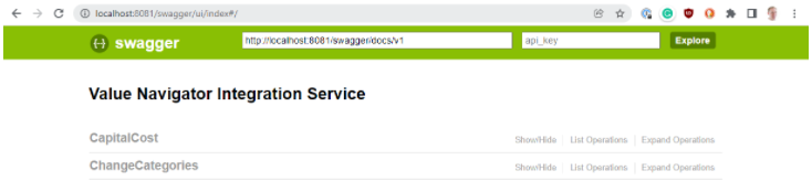 Once configured, the Val Nav Integration Service can be tested by visiting http://localhost:8081/swagger/ui/index from a web-browser on the machine running the Val Nav Integration Service. This will display the API documentation.