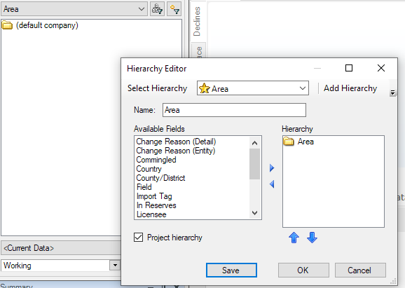 This database is empty of wells to begin with. It has a single custom field called Area and a corresponding Area hierarchy defined: